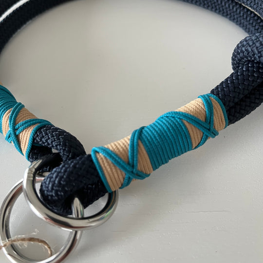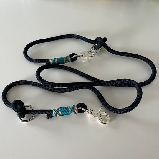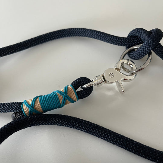 Das Set besticht durch ein schlichtes und edles Design mit einer Kombination aus tiefseeblauem Seil, einer Kreuztakelung in leuchtendem aqua und sand und Ringen und Karabinern aus Silber. Die Leine ist 2fach verstellbar mit einer Gesamtlänge von 2 Metern. Das doppelt gelegte Retrieverhalsband mit verstellbarem Zugstopp ist geeignet für Hunde mit einem Halsumfang bis zu 36 cm (kann kleiner gestellt werden).