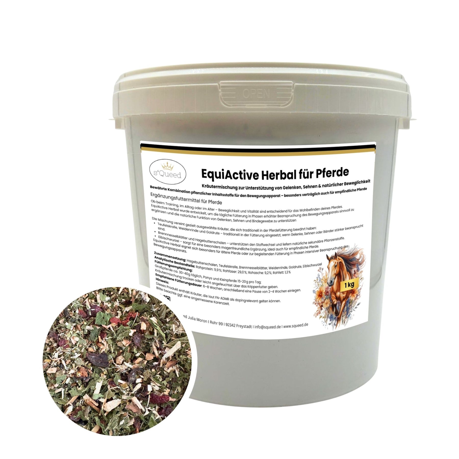 Mit zunehmendem Alter oder nach höheren Belastungen kann der Bewegungsapparat deines Pferdes stärker beansprucht werden. EquiActive Herbal ist eine sorgfältig zusammengestellte Kräutermischung, die den natürlichen Stoffwechsel von Gelenken, Sehnen und Bindegewebe begleitet und die normale Beweglichkeit unterstützen kann.