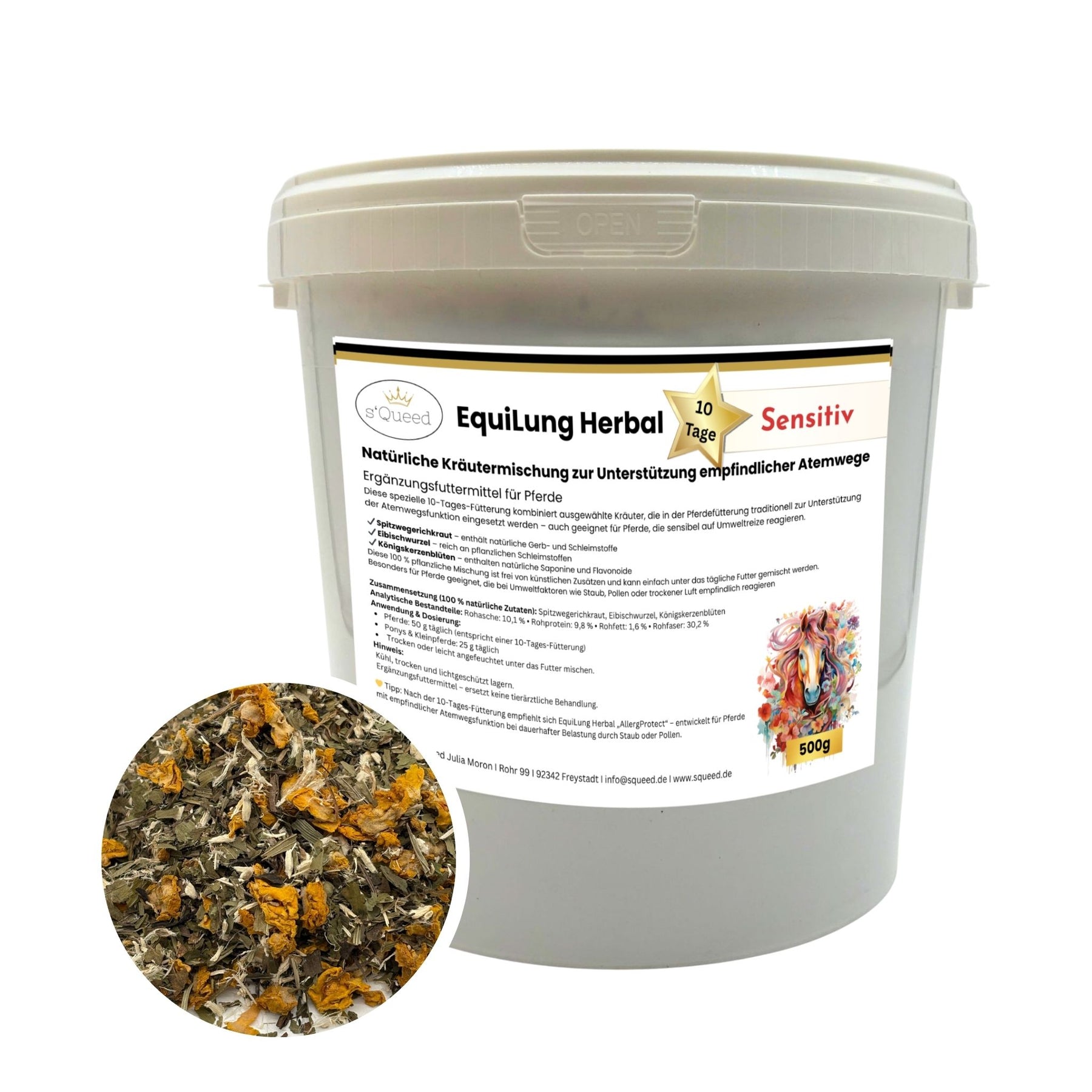 • Experten-Tipp: Nach der 10-tägigen Intensiv-Fütterung mit EquiLung Herbal Sensitiv empfehlen wir zur langfristigen Stabilisierung den Wechsel auf EquiLung Herbal AllergProtect, um die Atemwege auch dauerhaft gegenüber saisonalen Umweltreizen zu stärken.